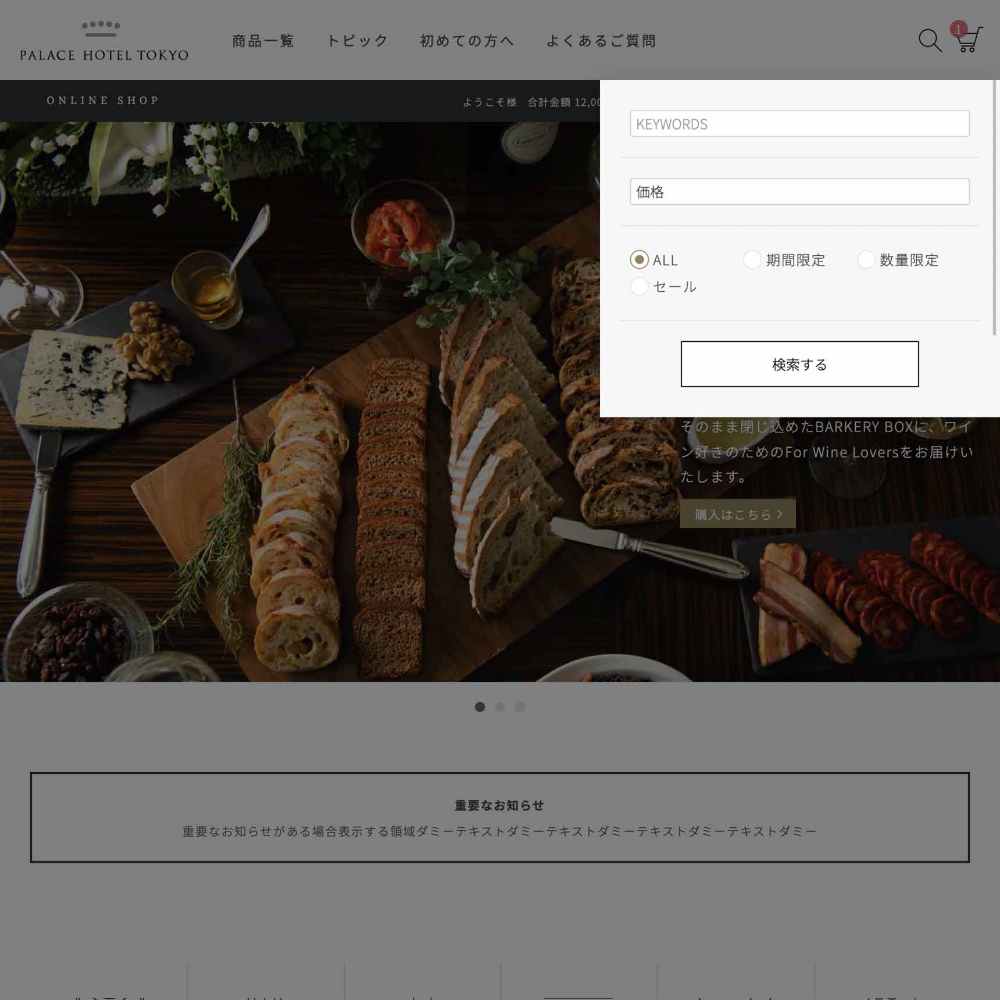 パレスホテル東京 オンラインショップ ページ上部に検索ボタンがございます。購入したい商品・気になる商品が決まっている場合は検索フォームから商品を検索してください。