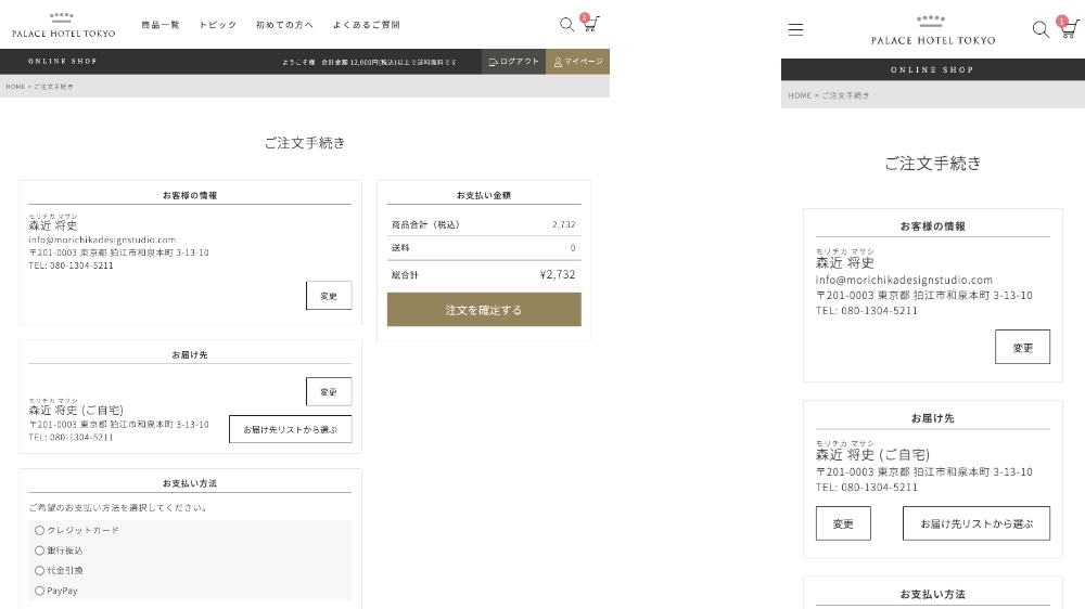 「ご注文内容確認」ページで、「お届け先」「支払い方法」「配送方法」などを指定し「注文を確定する」ボタンをクリックすると注文完了です。